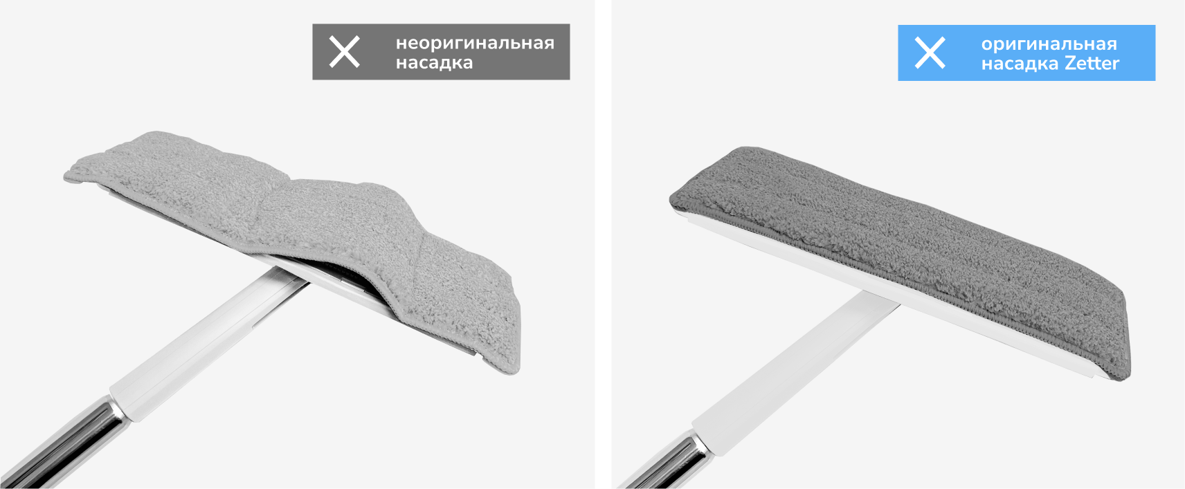 Долговечность. Оригинальные насадки Zetter отличаются высокой износостойкостью и рассчитаны на длительное использование. Они выдерживают множество циклов уборки и стирок, сохраняя форму, плотность ворса и надежное прилегание к основанию швабры.