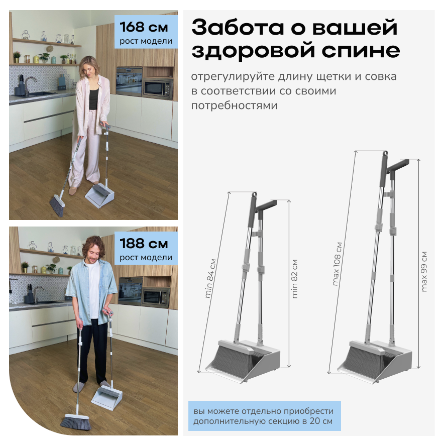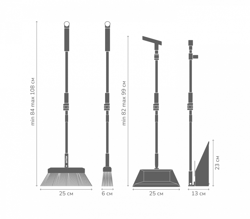 Щетка с совком Zetter оснащена отверстием для подвеса на рукоятке, что позволяет удобно хранить набор в сложенном состоянии. В комплекте с совком и щеткой для уборки вы получаете телескопическую секцию с рукояткой для щетки, телескопическую секцию с рукояткой и зажимом для совка, соединитель и совок.