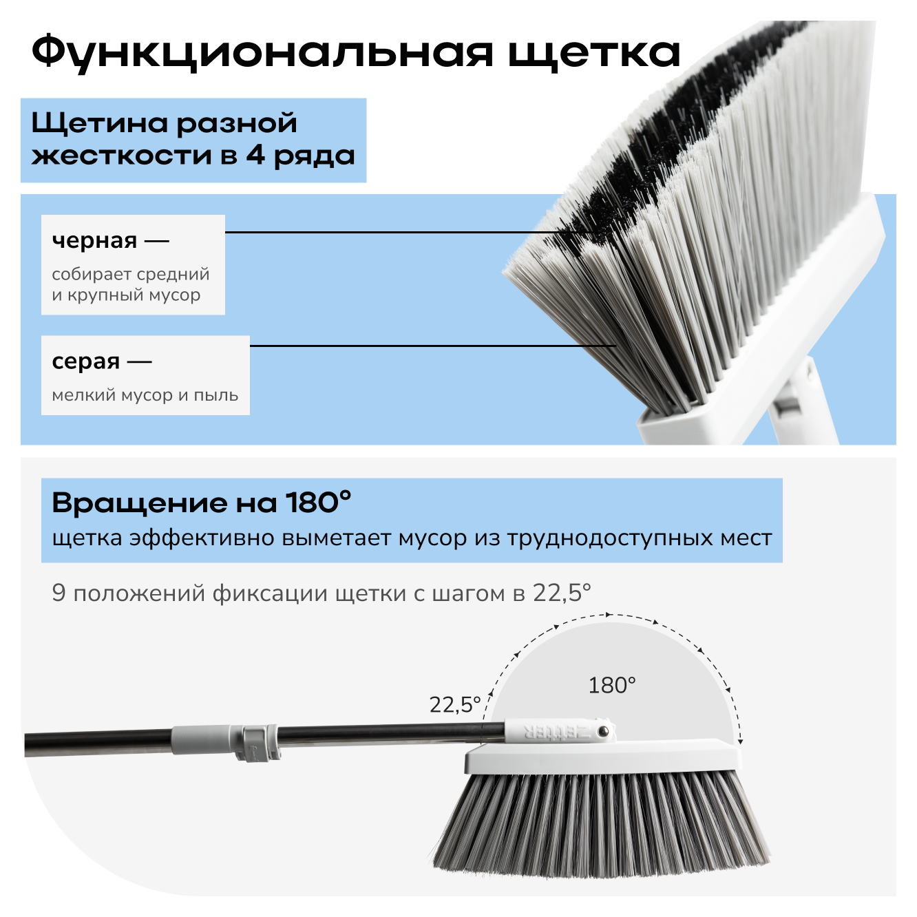 Вращающаяся на 180 градусов щетка веника для пола эффективно выметает грязь из углов и труднодоступных мест. Густая ПЭТ-щетина в 4 ряда разной жесткости собирает пыль и мелкий мусор.
