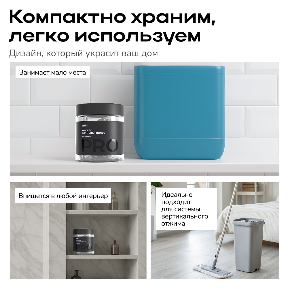 Таблетки для мытья полов помогут быстро, удобно и эффективно провести уборку дома. Продукт бренда Zetter - компактная и простая в использовании альтернатива жидким средствам. Бытовая химия не содержит хлора и обладает приятным ароматом лаванды, хорошими моющими способностями. Она безвредна для всех видов влагостойких напольных покрытий и септиков. Концентрированное средство в удобной эргономичной форме таблетки за пару минут растворяется в воде. Для общей влажной уборки достаточно 1 таблетки на 5 литров теплой воды. Эта жидкость обладает глубоким очищающим и антибактериальным эффектом, не нуждается в смывании. Раствор не оставляет разводы, легко очищает от загрязнений и пятен. Концентрат идеален для удаления грязи и пыли с поверхности ламината и линолеума, паркета и плитки. С ним обеспечена чистота и приятный запах в квартире. Компактная упаковка не займет много места для хранения. Для достижения идеального результата рекомендовано использование систем для уборки ZETTER.