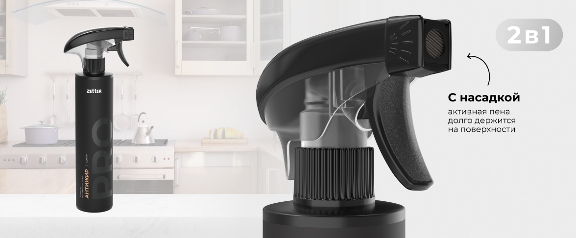 Удаляет все виды загрязнений жировых загрязнений на посуде, бытовой технике, кафеле, кухонных плитах и в зоне барбекю.