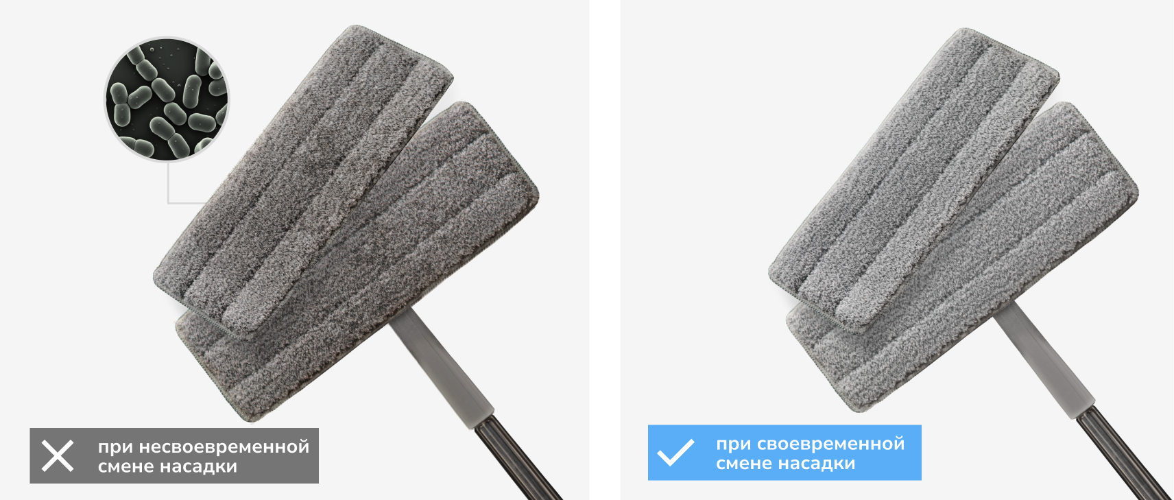 Удобство использования. Новая насадка лучше впитывает влагу, легче скользит по поверхности и эффективнее удаляет загрязнения, делая процесс уборки быстрее и комфортнее.