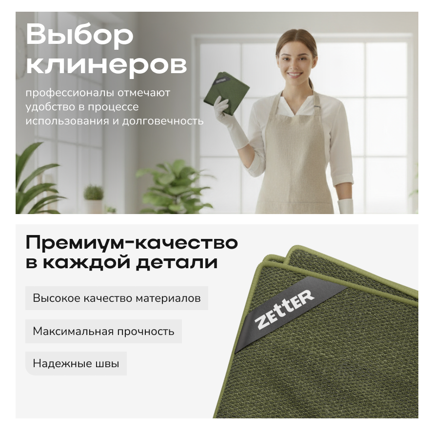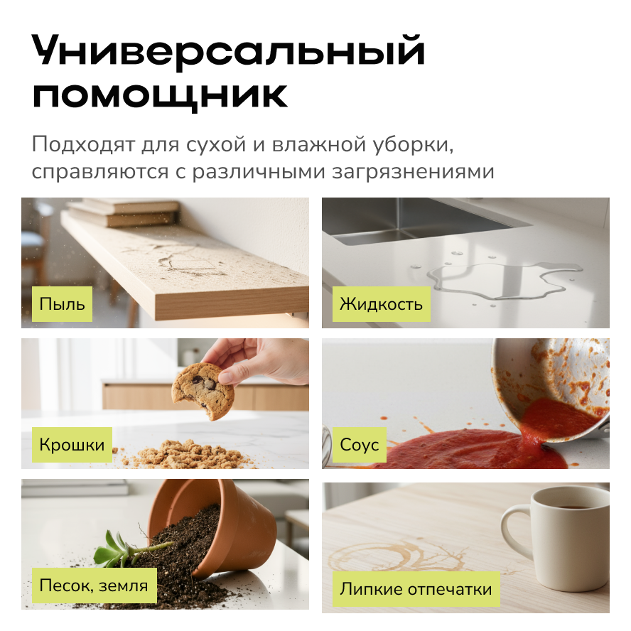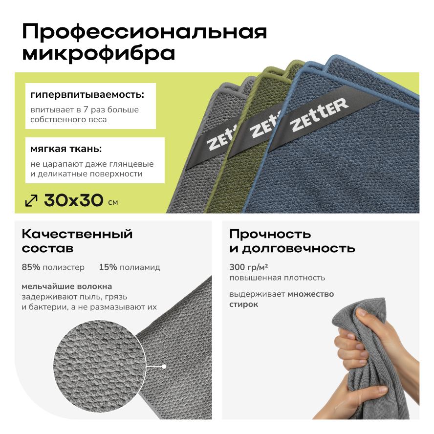 Набор салфеток Zetter — эффективное решение для идеальной чистоты без разводов, ворса и царапин на глянец и деликатные поверхности. Мягкие полотна одинаково хорошо работают в сухом и влажном режиме, собирая пыль, крошки, шерсть и впитывая проливы с первого прохода.