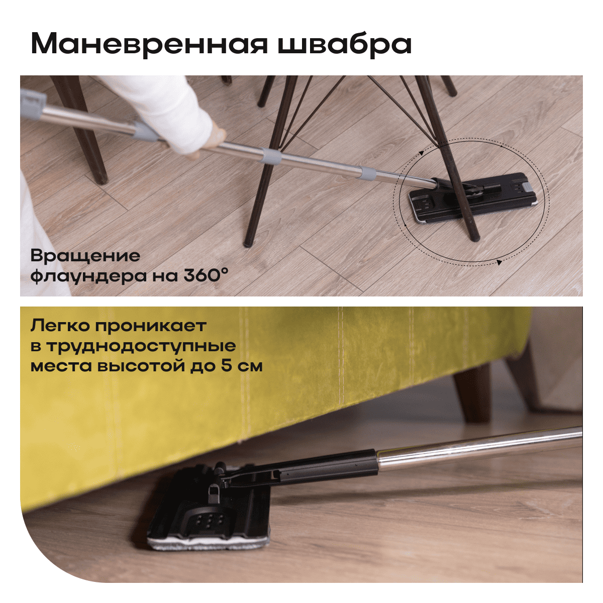 • Профессиональная швабра с насадкой из микрофибры и маневренным вращением на 360° для легкого доступа в труднодоступные места.