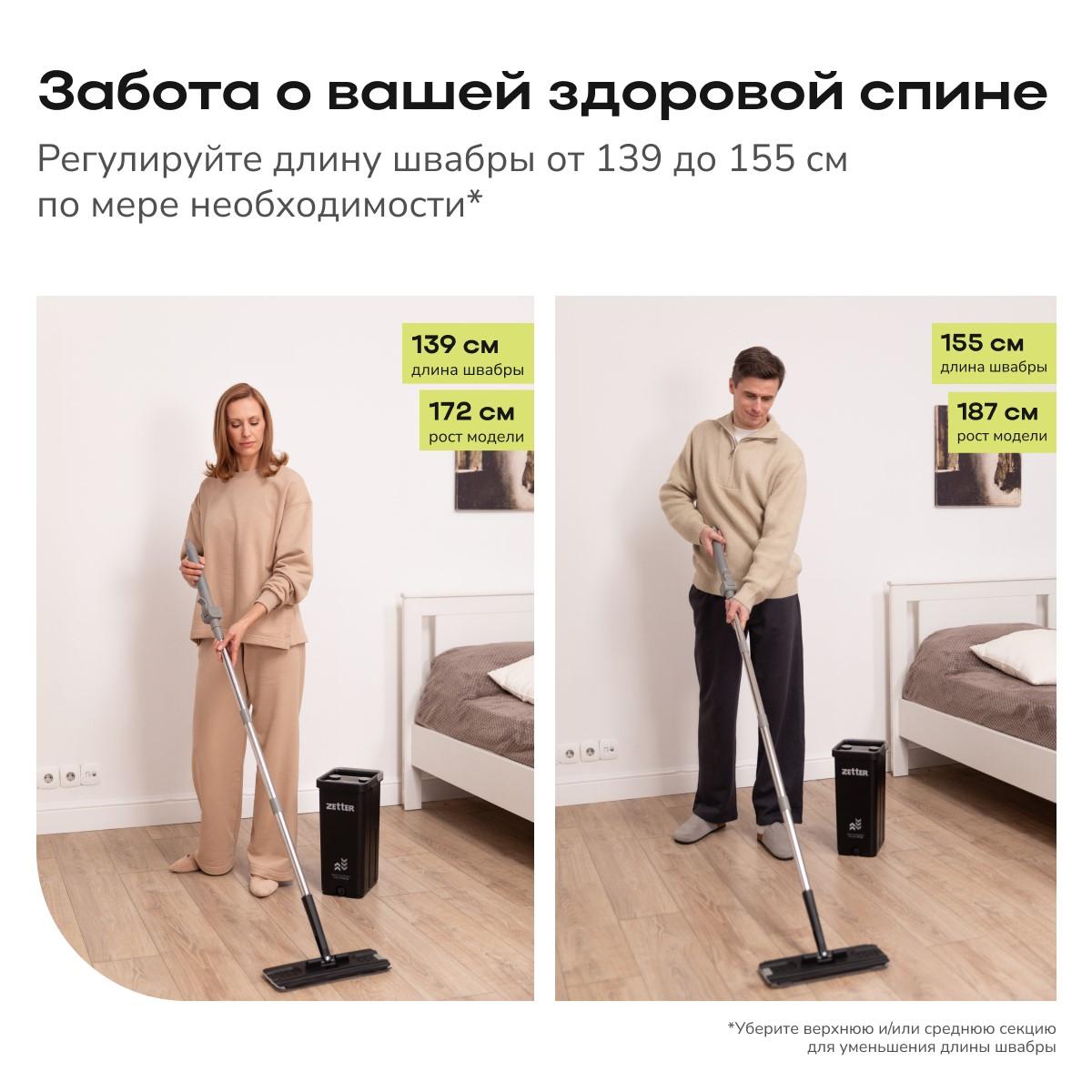 • Регулируемая телескопическая ручка позволяет подстроить длину швабры под рост пользователя, обеспечивая удобство использования.