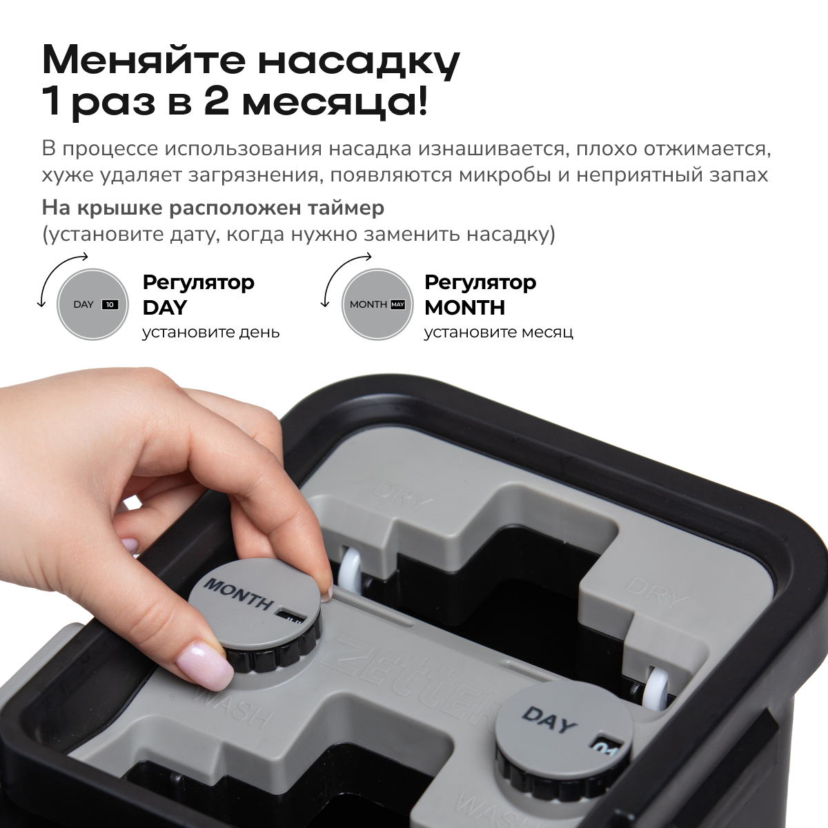 • Таймер на крышке ведра напоминает о необходимости замены насадки, что облегчает уход за комплектом.