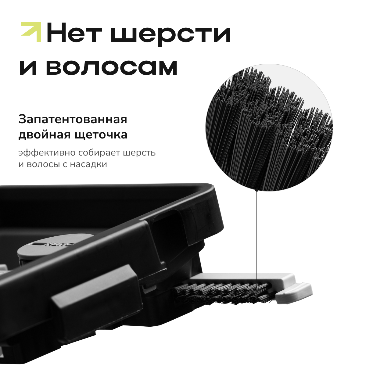 • Двухкамерное ведро с системой отжима и запатентованной двойной щеточкой эффективно очищает насадку от грязи, шерсти и волос без контакта рук.