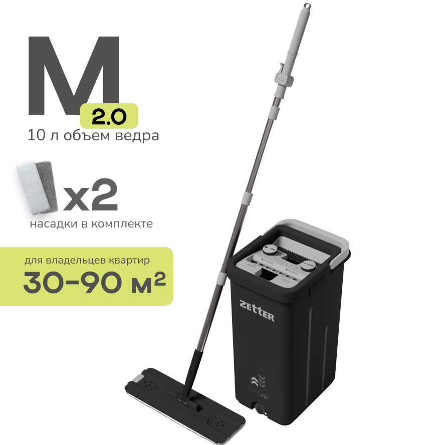 Швабра с отжимом и ведром Zetter M 2.0 (10 л), цвет черный