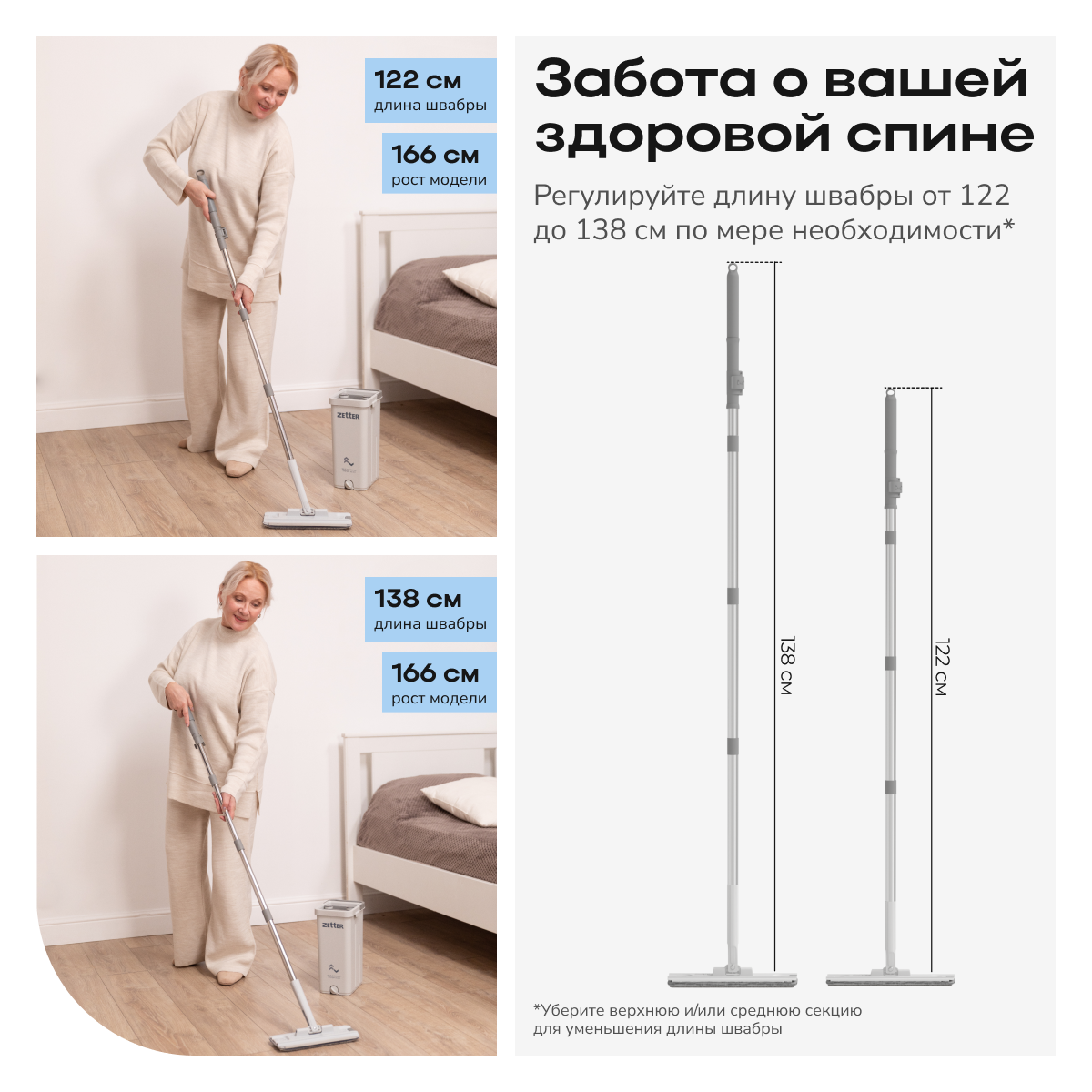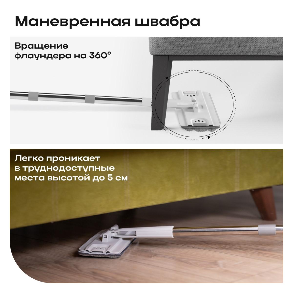 • Регулируемая телескопическая ручка позволяет подстроить длину швабры под рост пользователя, обеспечивая удобство использования.