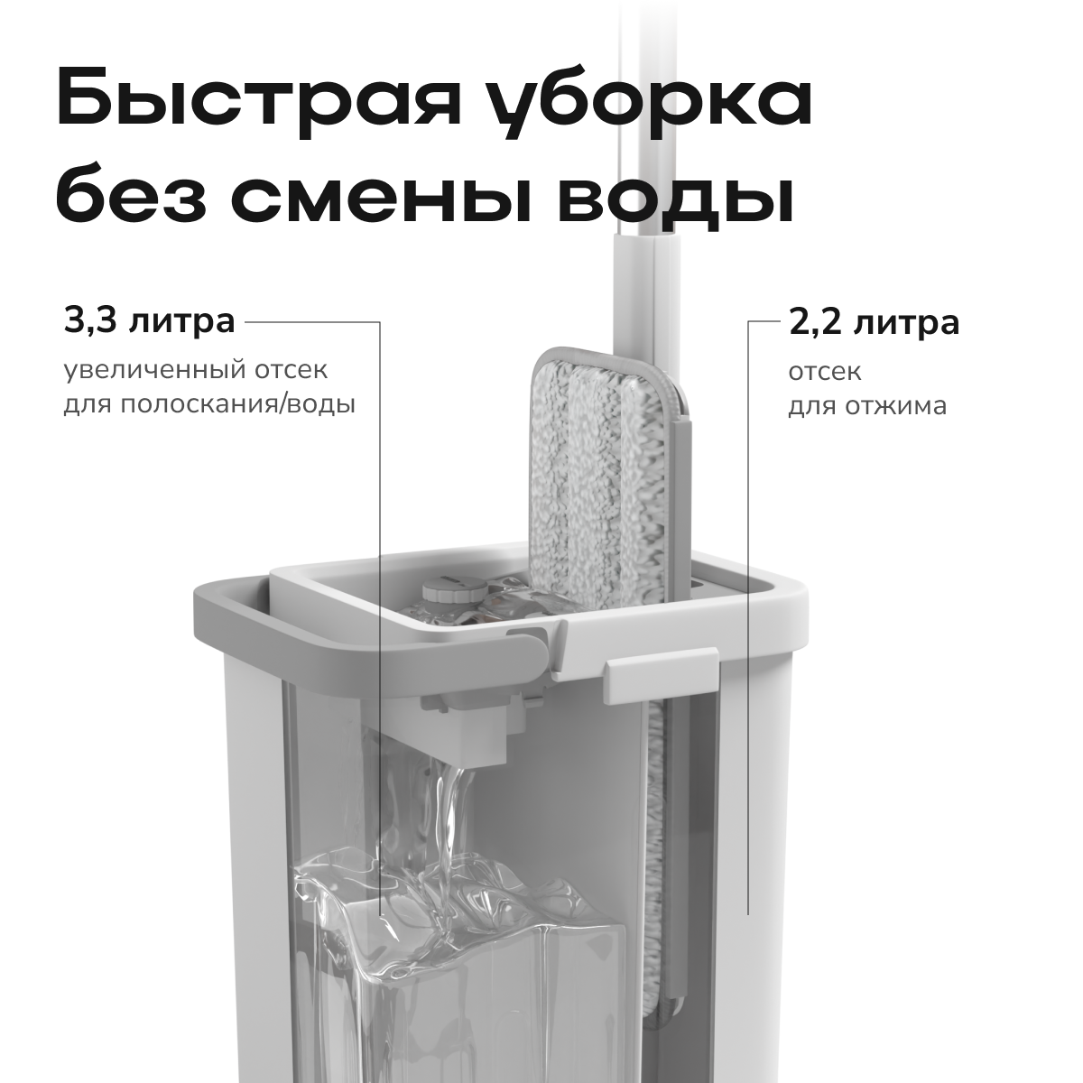 Телескопическая ручка, таймер смены насадки на крышке ведра, увеличенный размер насадки и флаундера, бесконтактный отжим.