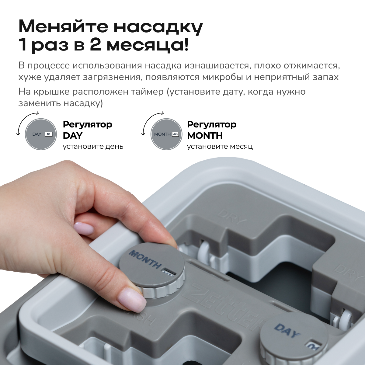 • Таймер на крышке ведра напоминает о необходимости замены насадки, что облегчает уход за комплектом.