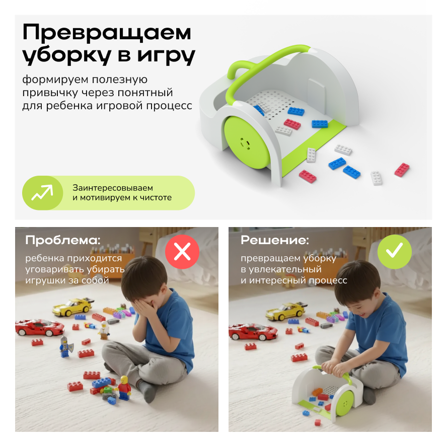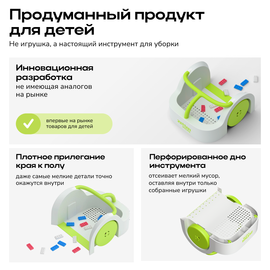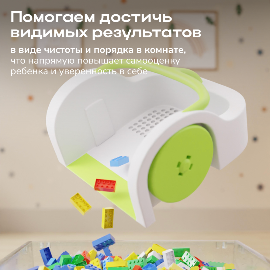Этот инструмент — отличный подарок для детской комнаты, который поможет быстро и легко навести порядок после игры с конструкторами и фигурками, сделает пол безопасным и освободит время родителей.