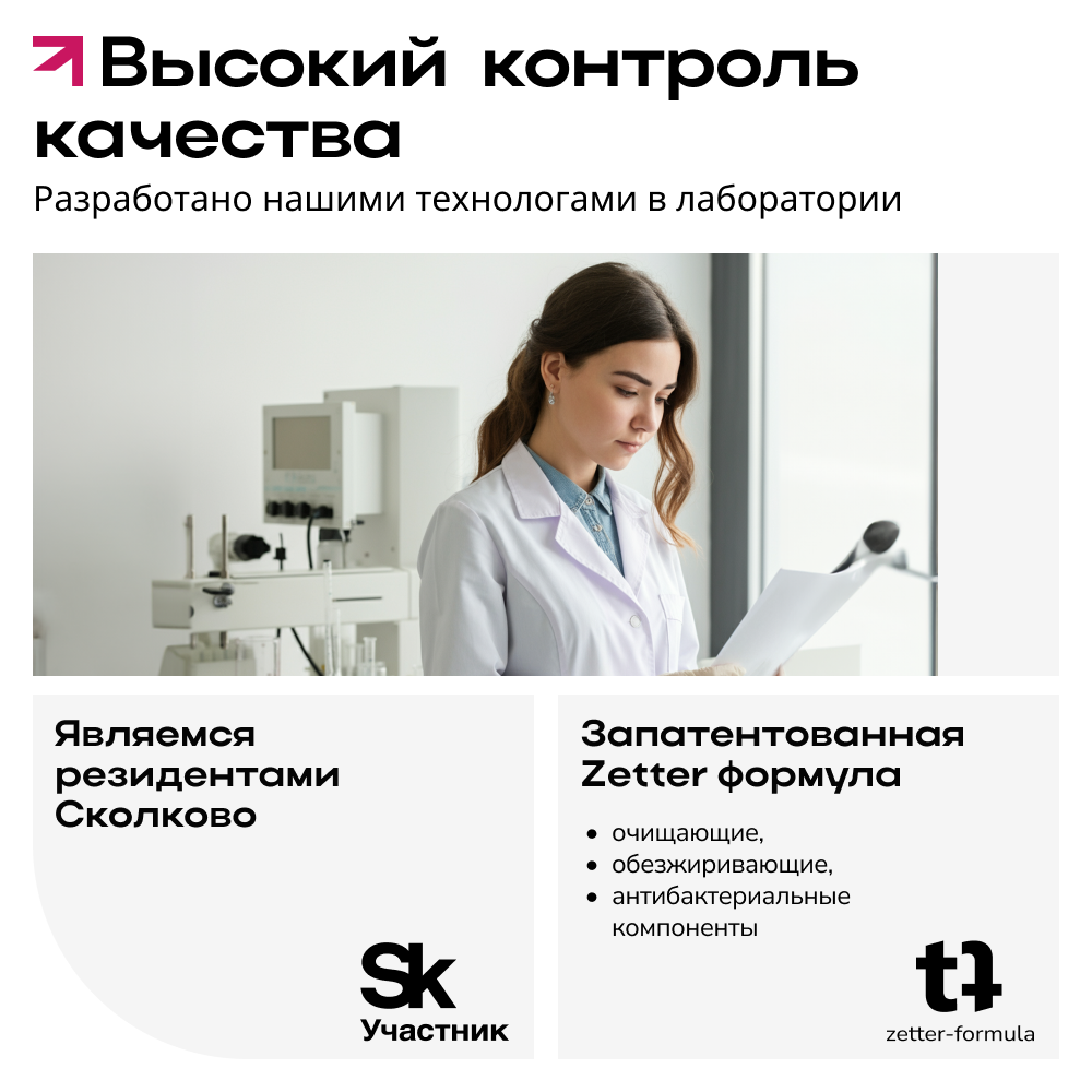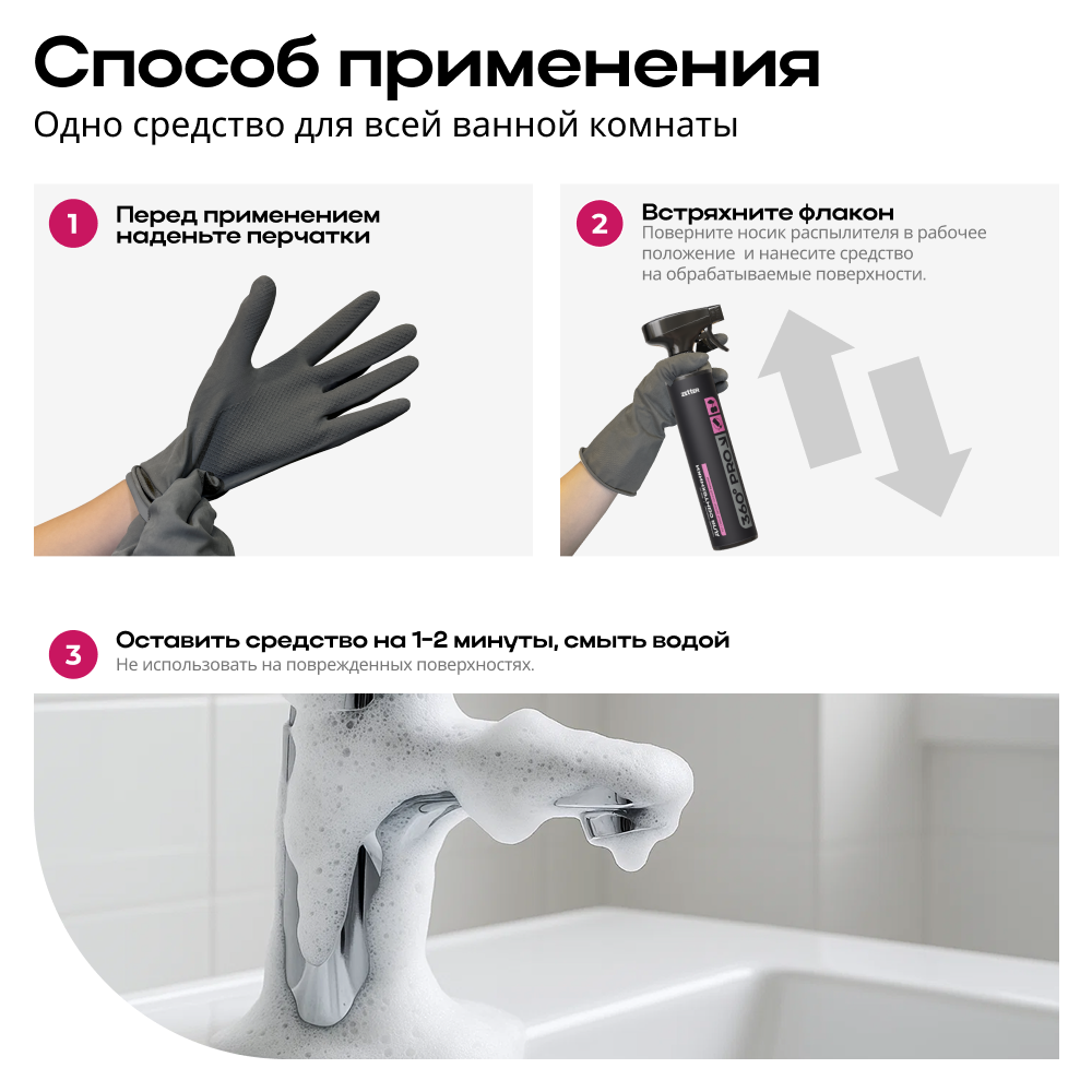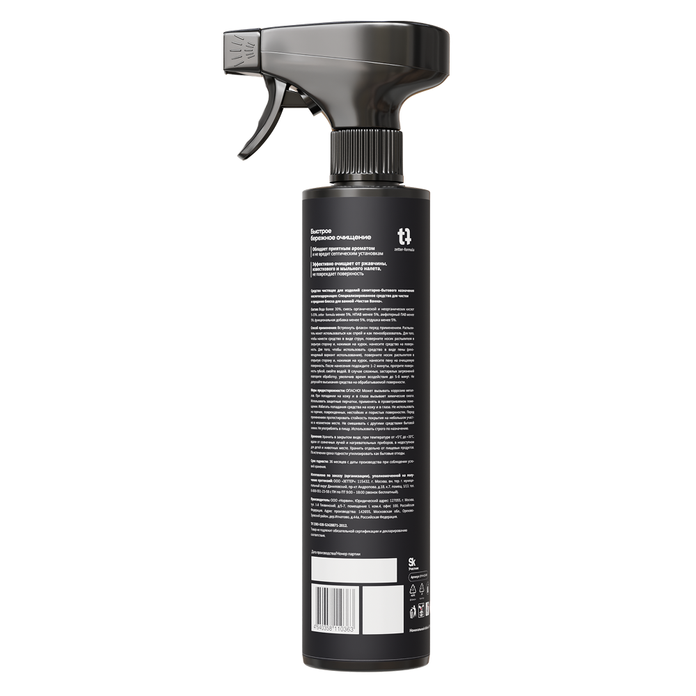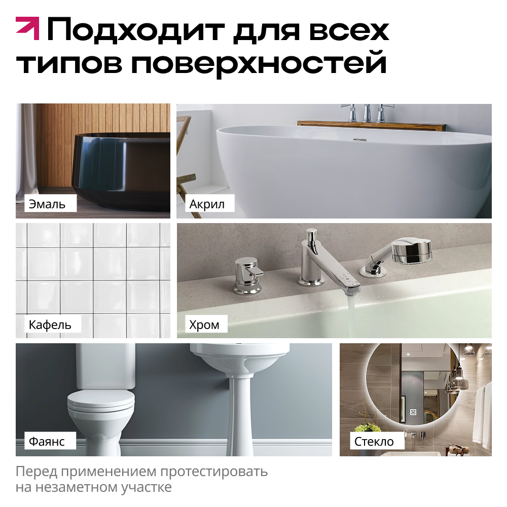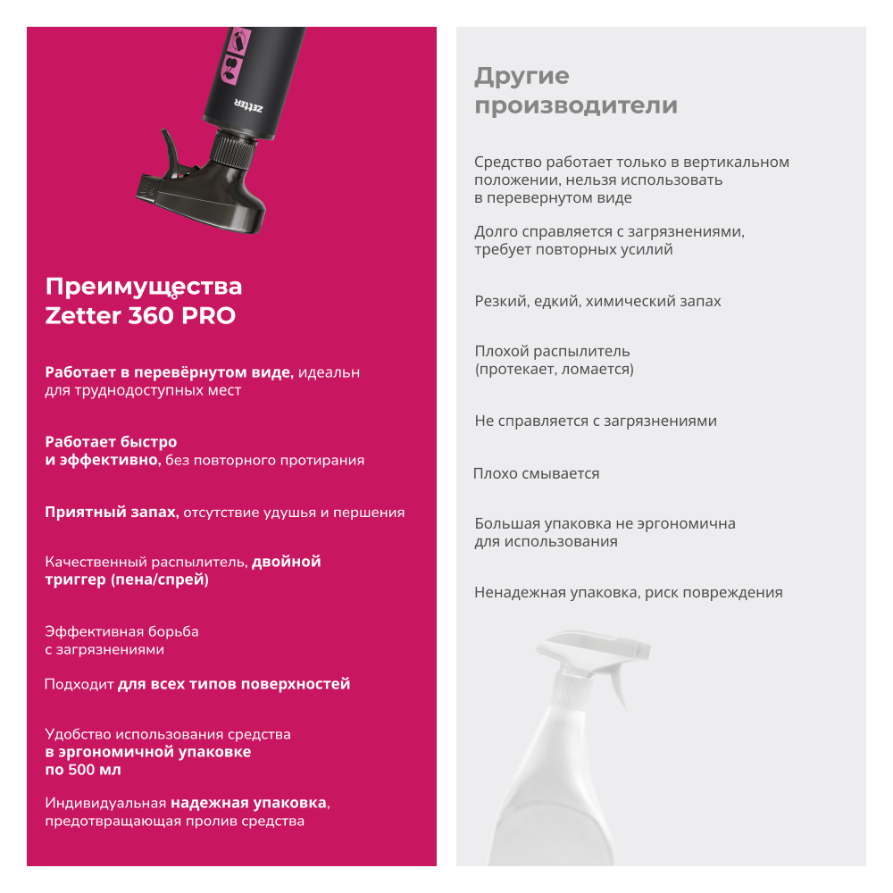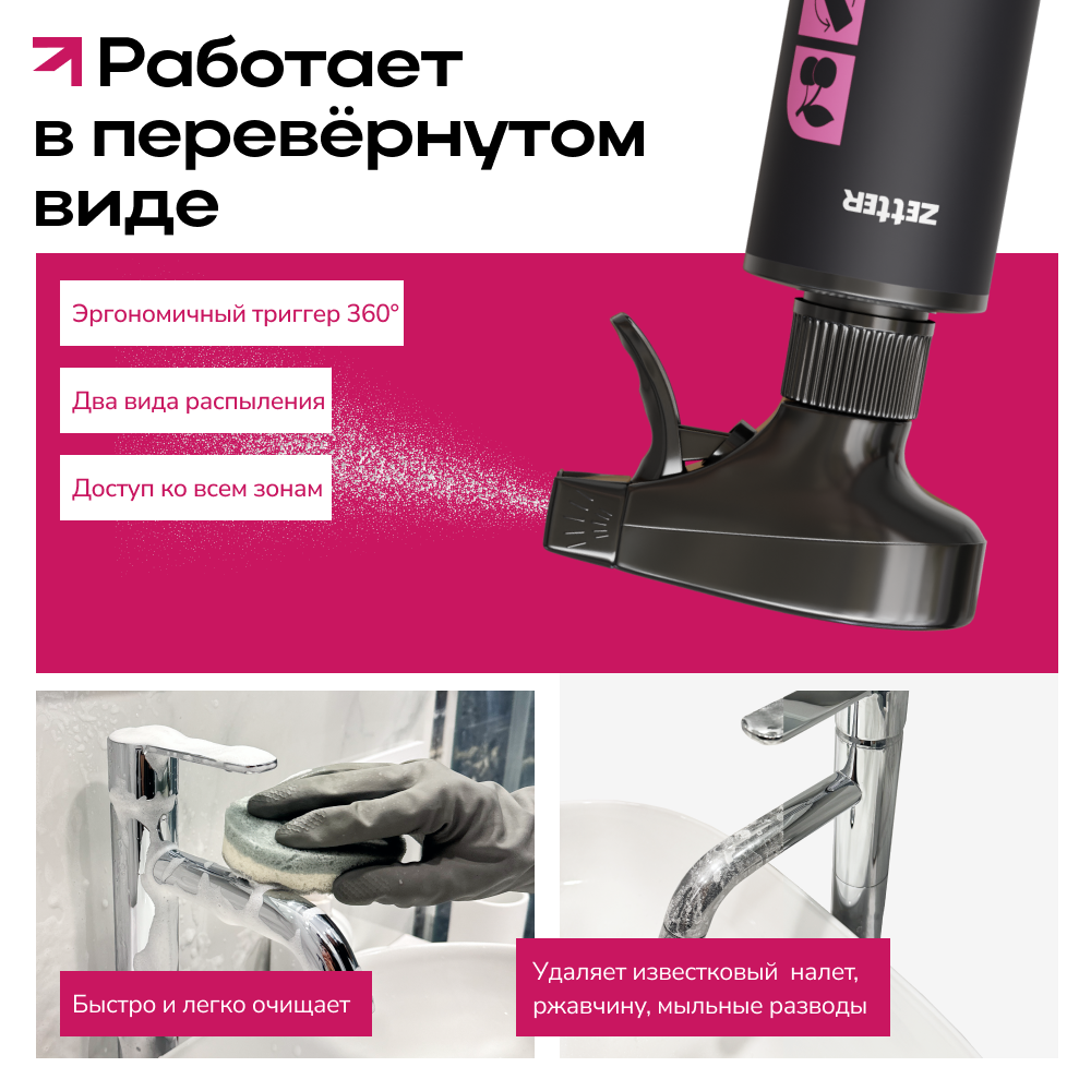 Благодаря инновационному распылителю Zetter 360 PRO, средство можно использовать под любым углом — это удобно при очистке труднодоступных мест. Формула спрей-пены бережно воздействует даже на деликатные поверхности — акрил, эмаль, керамику и плитку.