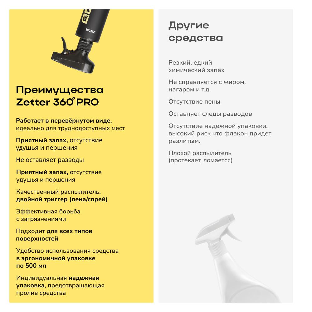 Благодаря инновационному распылителю Zetter 360 PRO, средство можно использовать под любым углом — это удобно при очистке труднодоступных мест. Пенная текстура равномерно распределяется по поверхности и повышает эффективность обработки. Удобный триггер-распылитель обеспечивает экономичный расход и точное нанесение. Сбалансированный состав с гидроксидом калия и натрия, содой и мягкими растворителями быстро разрушает стойкие загрязнения и облегчает чистку.