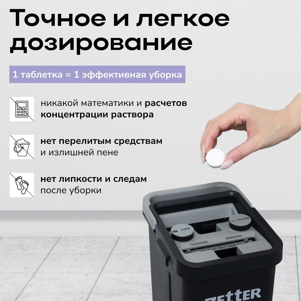 Таблетки для мытья полов помогут быстро, удобно и эффективно провести уборку дома. Продукт бренда Zetter - компактная и простая в использовании альтернатива жидким средствам. Бытовая химия не содержит хлора и обладает приятным ароматом лаванды, хорошими моющими способностями. Она безвредна для всех видов влагостойких напольных покрытий и септиков. Концентрированное средство в удобной эргономичной форме таблетки за пару минут растворяется в воде. Для общей влажной уборки достаточно 1 таблетки на 5 литров теплой воды. Эта жидкость обладает глубоким очищающим и антибактериальным эффектом, не нуждается в смывании. Раствор не оставляет разводы, легко очищает от загрязнений и пятен. Концентрат идеален для удаления грязи и пыли с поверхности ламината и линолеума, паркета и плитки. С ним обеспечена чистота и приятный запах в квартире. Компактная упаковка не займет много места для хранения. Для достижения идеального результата рекомендовано использование систем для уборки ZETTER.
